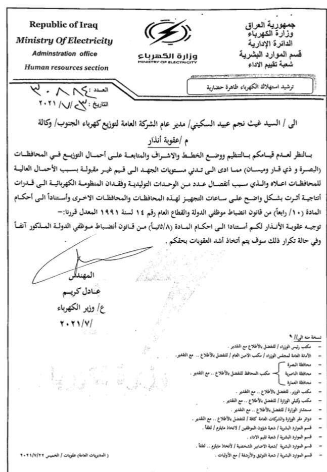 بالوثيقة وزير الكهرباء وكالة عادل كريم يوجه عقوبة الأنذار لمدير الشركة العامة لتوزيع كهرباء الجنوب المهندس غيث نجم عبيد بسبب عدم الالتزام بساعات التجهيز والقطع المبرمج في محافظة البصرة ".