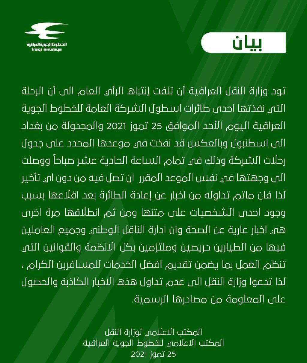 الخطوط الجوية ترد على أنباء إعادة طائرة الى أسطنبول بسبب شخصية موجودة على متنها .