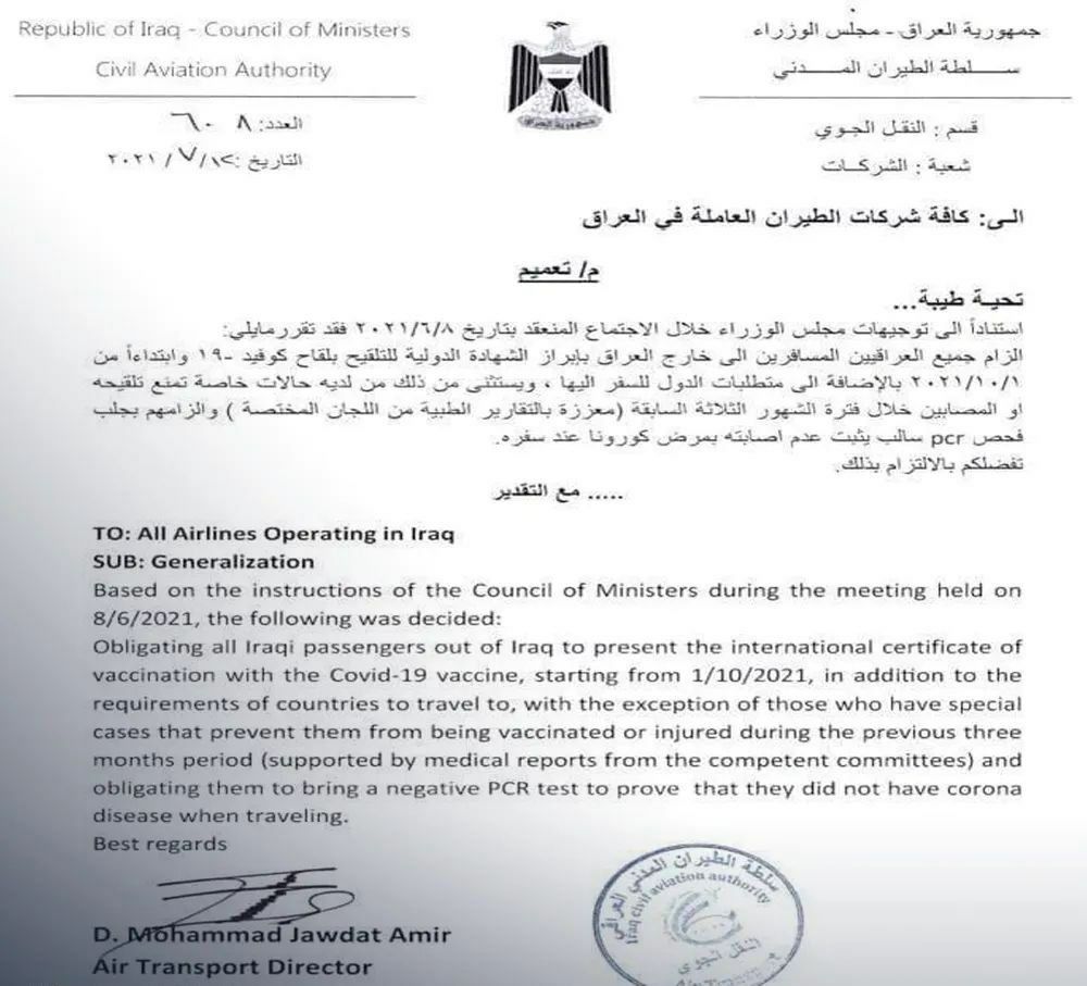 بالوثيقة..العراق يمنع الاشخاص غير "الملقحين" من السفر ابتداءً من تاريخ 2021-10-1.
