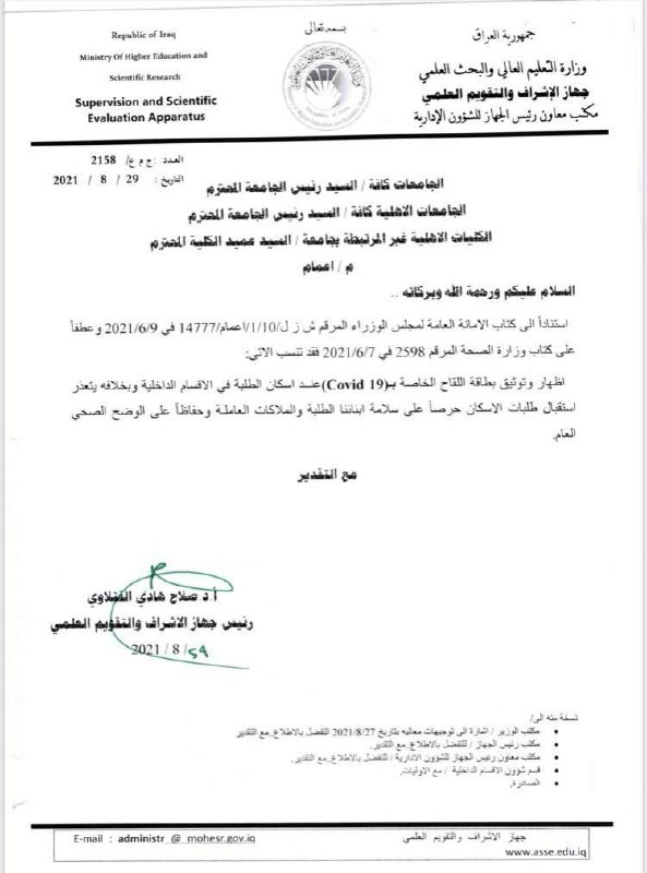 بالوثيقة.. وزارة التعليم العالي تقرر عدم اسكان الطلبة في الأقسام الداخلية الا بعد جلب بطاقة التلقيح.