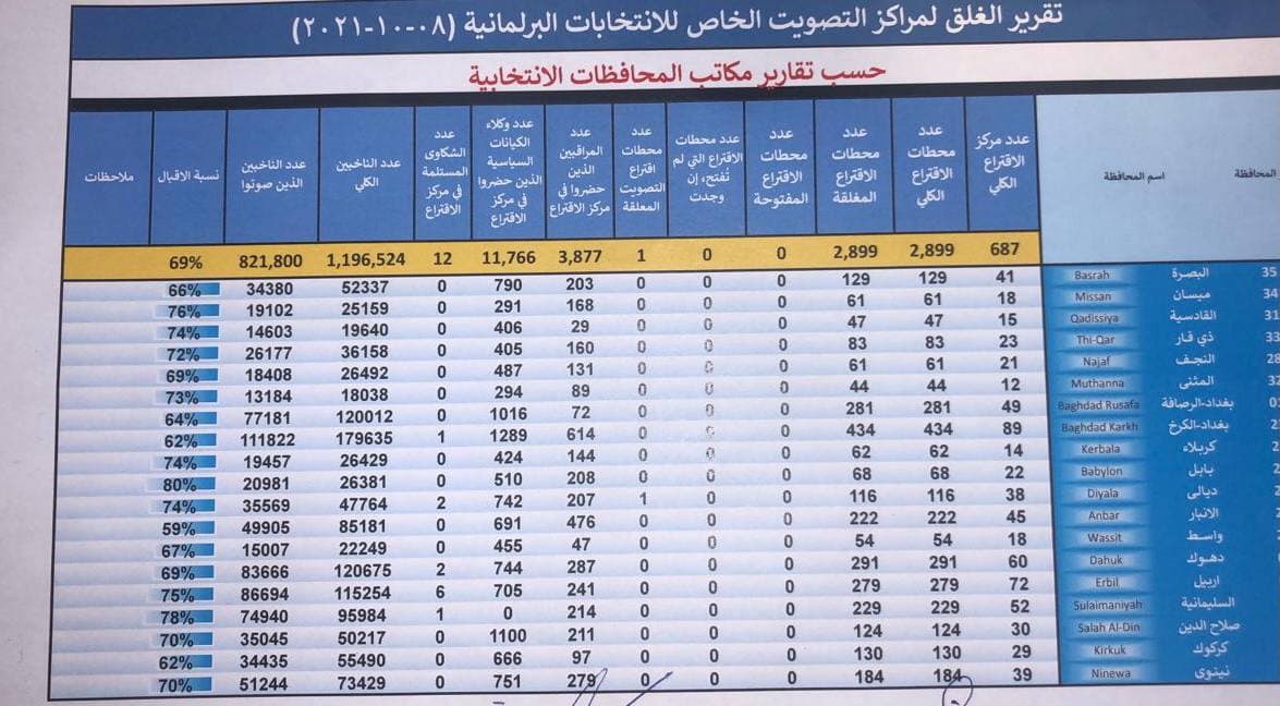 نسبة التصويت في كل محافظة عراقية بالاقتراع الخاص (وثيقة)