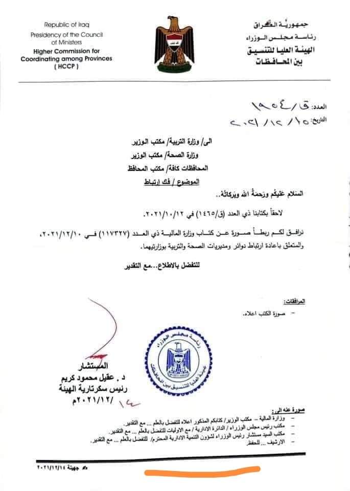 المصادقة على قرار بإعادة ربط دوائر التربية والصحة في المحافظات بالوزارات الاتحادية