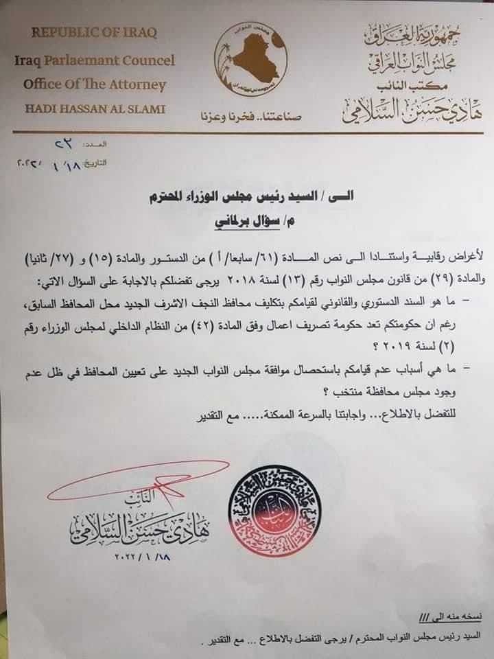 بالوثيقة.. أول سؤال نيابي في البرلمان الجديد الى الكاظمي بخصوص محافظ النجف