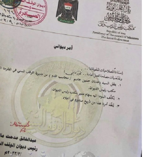 اصدر رئيس ديوان الوقف السني الجديد، عبدالخالق مدحت، اليوم الاربعاء، اول قرار له بعد تسنمه المنصب.