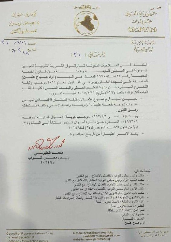 بالوثيقة.. خريج كلية القانون يتم تعينه من الحلبوسي مستشارا إقتصاديا في البرلمان بدرجة خاصة