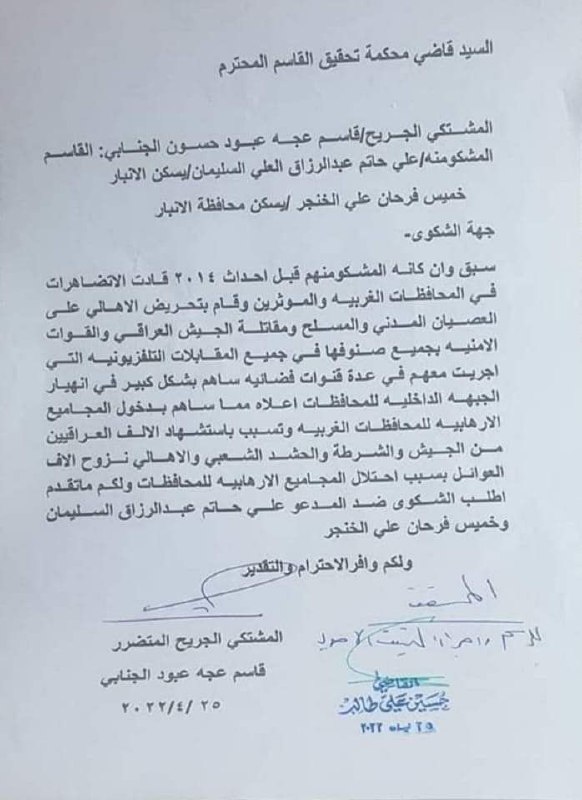 وبحسب وثيقة مقدمة الى محكمة تحقيق القاسم انه “سبق وكان المشكو منهم قبل احداث 14 قادة التظاهرات في المحافظات الغربية والمؤثرين وقاموا بتحريض الاهالي على العصيان المدني والمسلح ومقاتلة الجيش العراقي والقوات