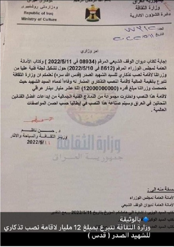 سرقة جديدة باسم الشهيد الصدر تحت ذريعة بناء نصب تذكاري له بمبلغ 12 مليار دينار ( وثيقة)