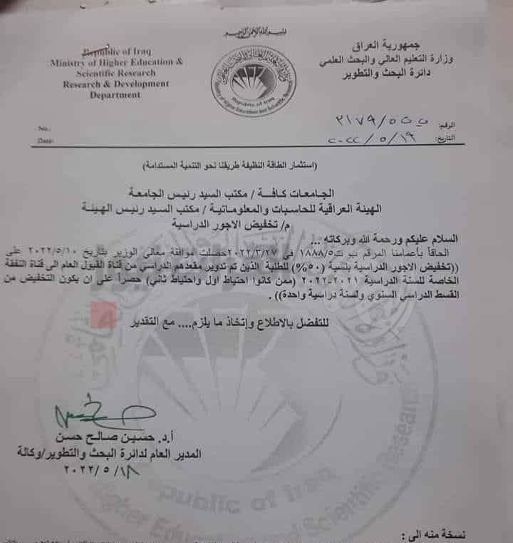 بالوثيقة.. وزارة التعليم تقرر تخفيض الأجور الدراسية لطلبة الدراسات العليا بنسبة ٥٠٪