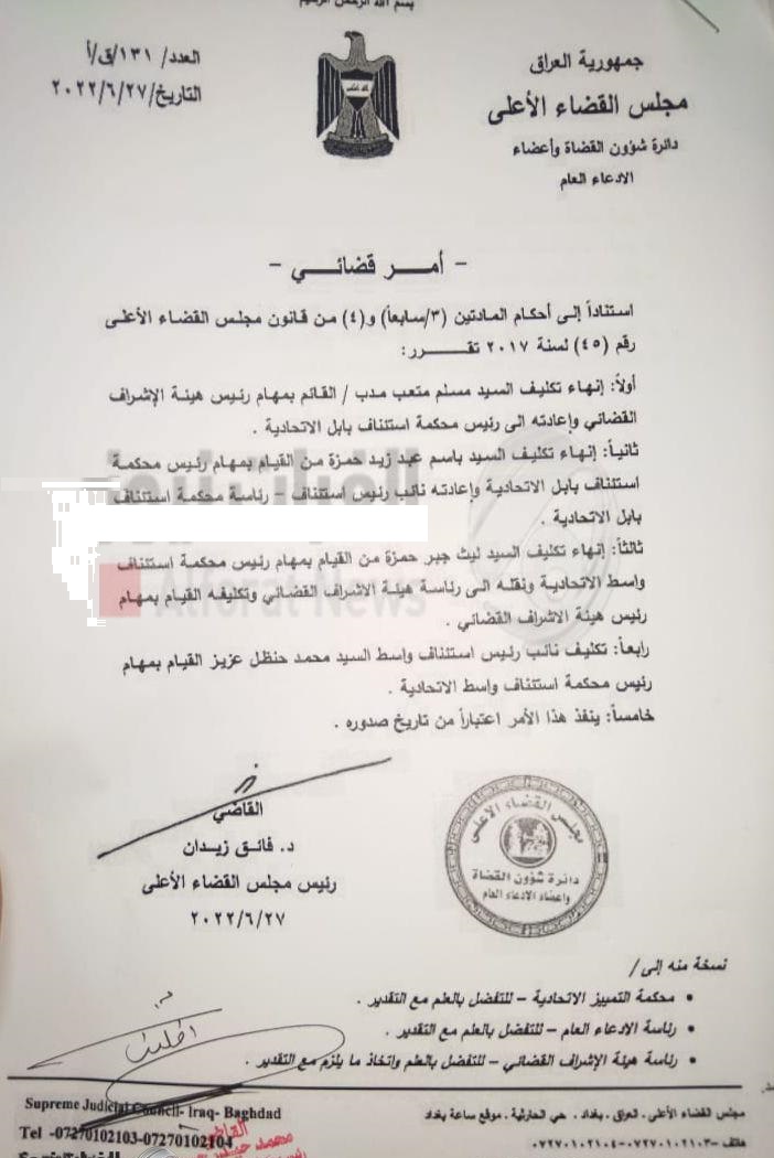 أصدر رئيس مجلس القضاء الأعلى، فائق زيدان، أمراً قضائياً طال 4 قضاة كبار تضمن انهاء تكليف بعضهم من المهام المناطة لهم.