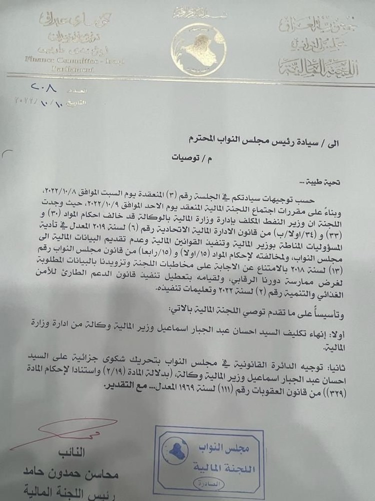 بالوثيقة.. البرلمان يوصي بانهاء تكليف وزير المالية وكالة وتحريك شكوى قضائية ضده