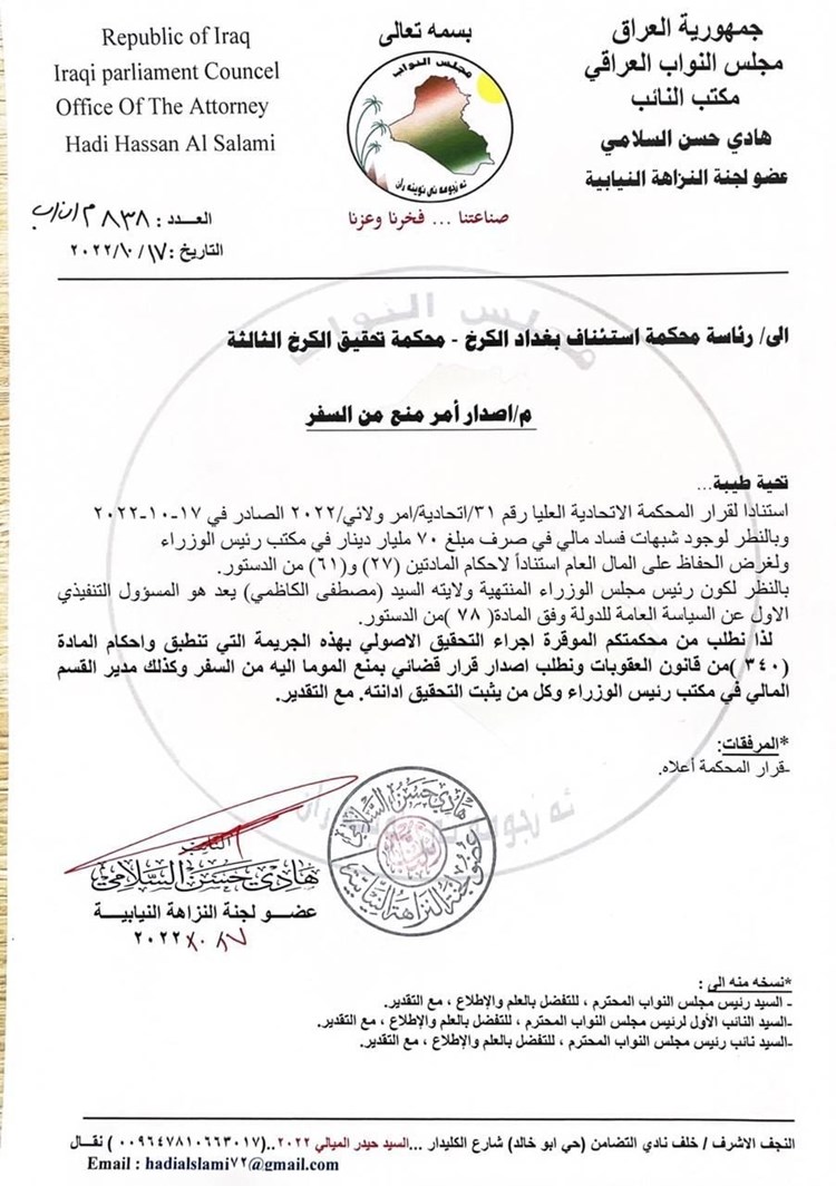بالوثيقة.. طلب نيابي لمنع سفر الكاظمي