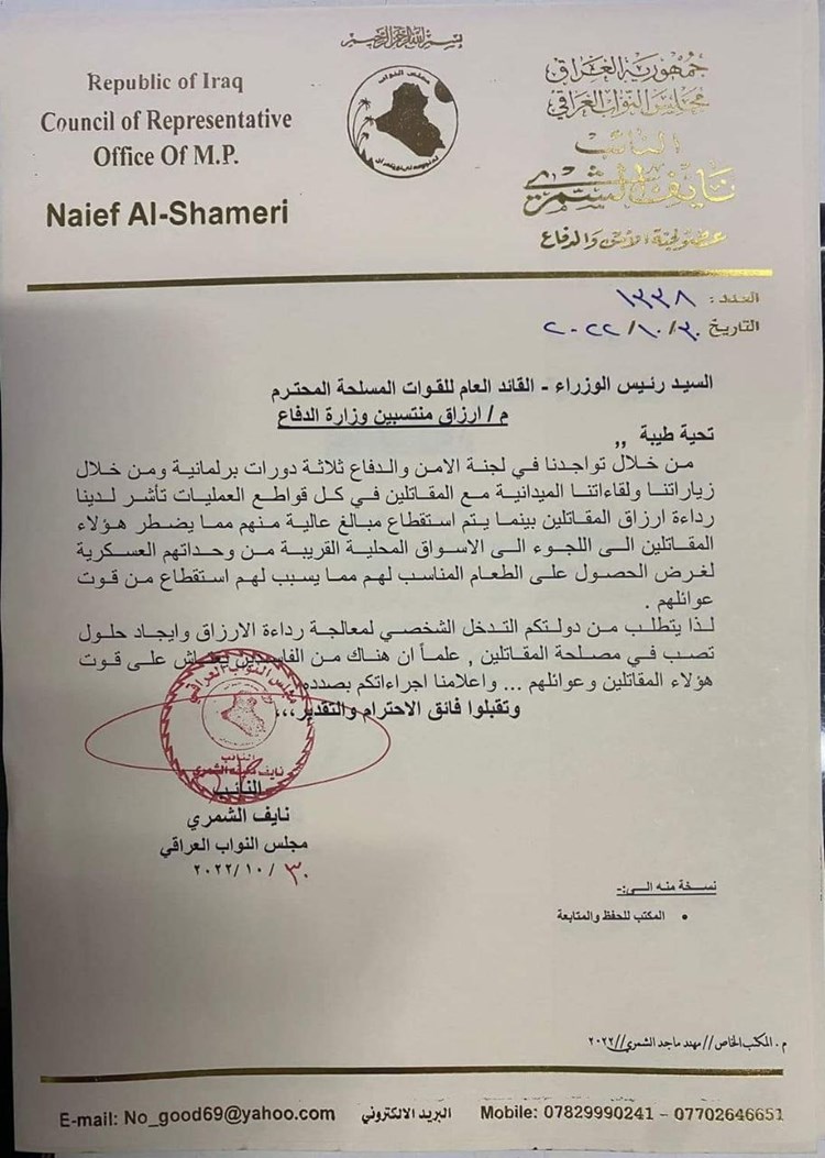 بالوثيقة.. نائب يطالب السوداني بالتدخل شخصيا لمعالجة مشكلة أرزاق المقاتلين