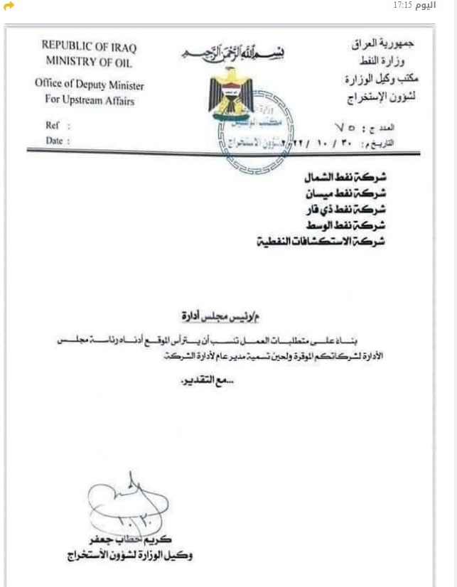 بالوثيقة.. انهاء تكليف مدير شركة نفط ذي قار وتكليف رئيس مجلس الادارة لتولي الموقع