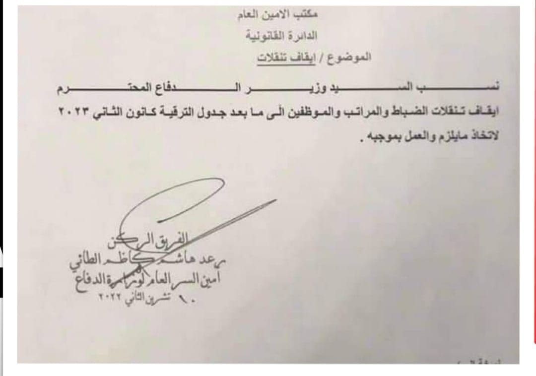 بالوثيقة .. وزير الدفاع يوجه بإيقاف التنقلات للضباط والمراتب والموظفين الى ما بعد جدول الترقية