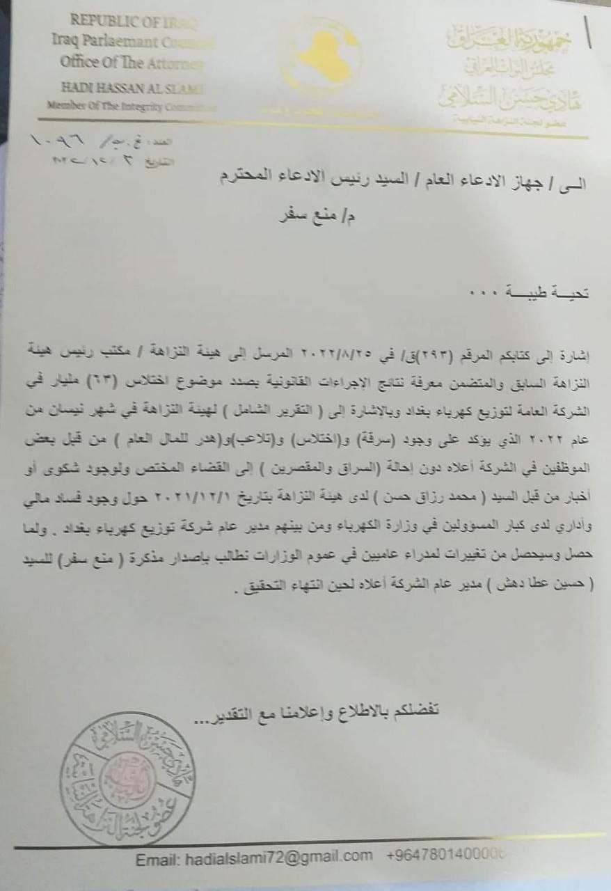 بالوثيقة .. النزاهة البرلمانية تطالب بمنع سفر مدير عام في وزارة الكهرباء