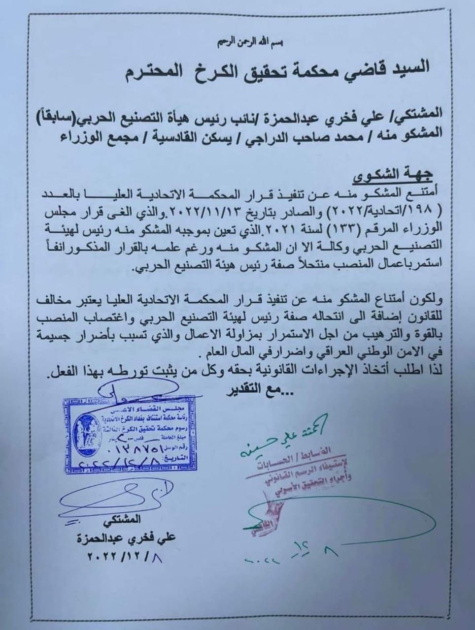 بالوثيقة.. دعوة قضائية ضد "محمد صاحب الدراجي" لامتناعه عن مغادرة منصب رئيس هيئة التصنيع