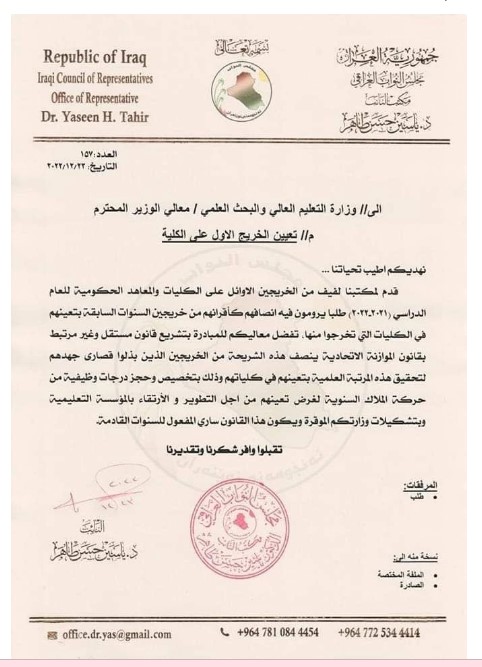 بالوثيقة..طلب نيابي لتعيين الخريج الأول على الكلية