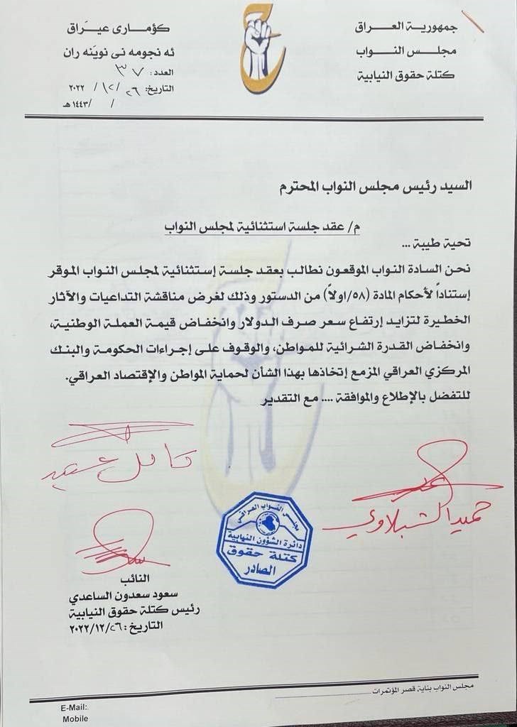 بالوثائق .. حركة حقوق تجمع تواقيع نيابية لعقد جلسة للبرلمان بهدف تخفيض الدولار