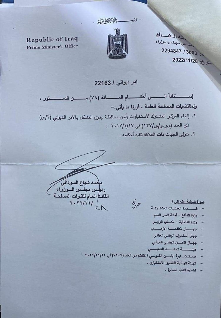 بالوثيقة ..السوداني يصدر امراً بانهاء مهام مركز التنسيق المشترك في نينوى