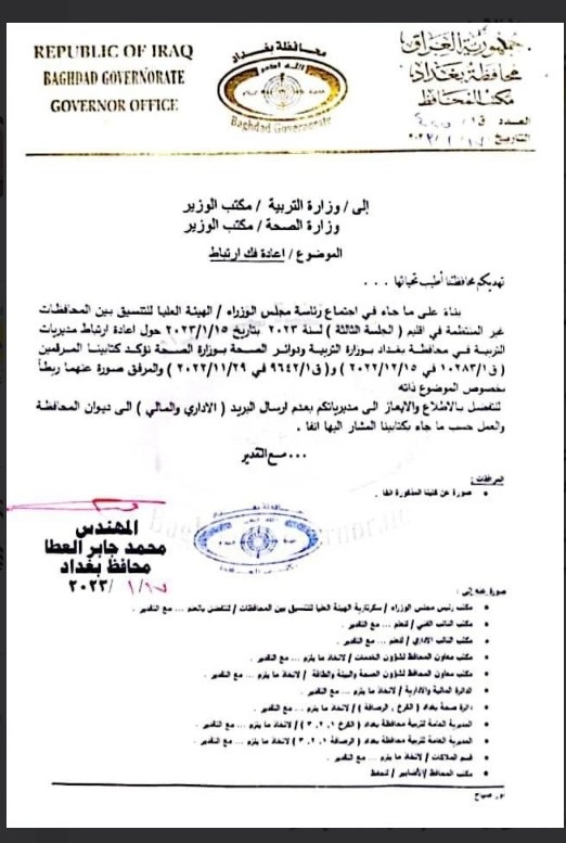 بالوثيقة.. محافظة بغداد تعيد ارتباط مديريات التربية ودوائر الصحة بوزارتهما الاتحادية