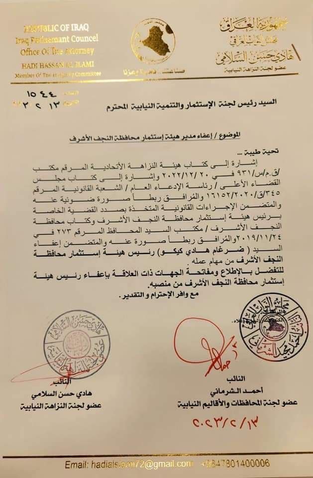 بالوثيقة.. طلب نيابي لاعفاء مدير استثمار النجف