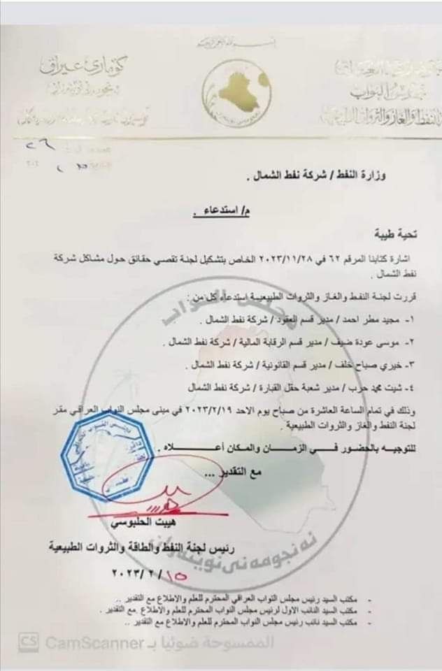 بالوثيقة..استدعاء اربعة مسؤولين في شركة نفط الشمال