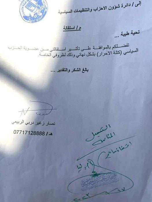 بالوثيقة.. استقالة الأمين العام للكتلة الصدرية نصار الربيعي من "الاحرار"