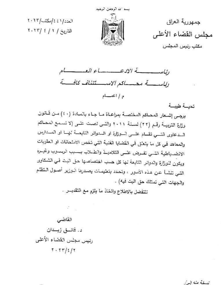 مجلس القضاء الأعلى يوجه بمنع إستلام المحاكم العراقية أي دعوى قضائية تعنى بالأمور الفنية الخاصة بالإمتحانات