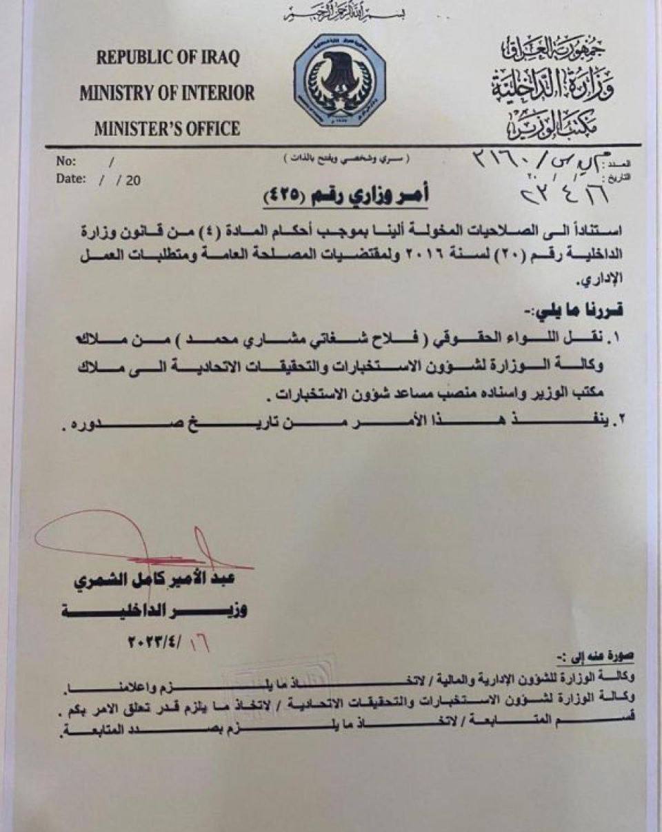 بالوثيقة تكليف اللواء فلاح شغاتي مساعداً لوزير الداخلية لشؤون الاستخبارات