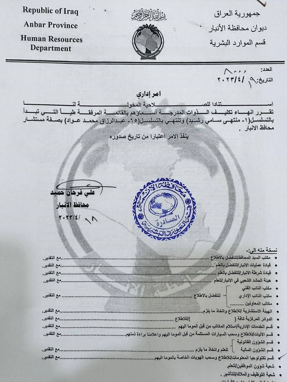 بالوثيقة.. اقالة 65 مستشارا لمحافظ الانبار