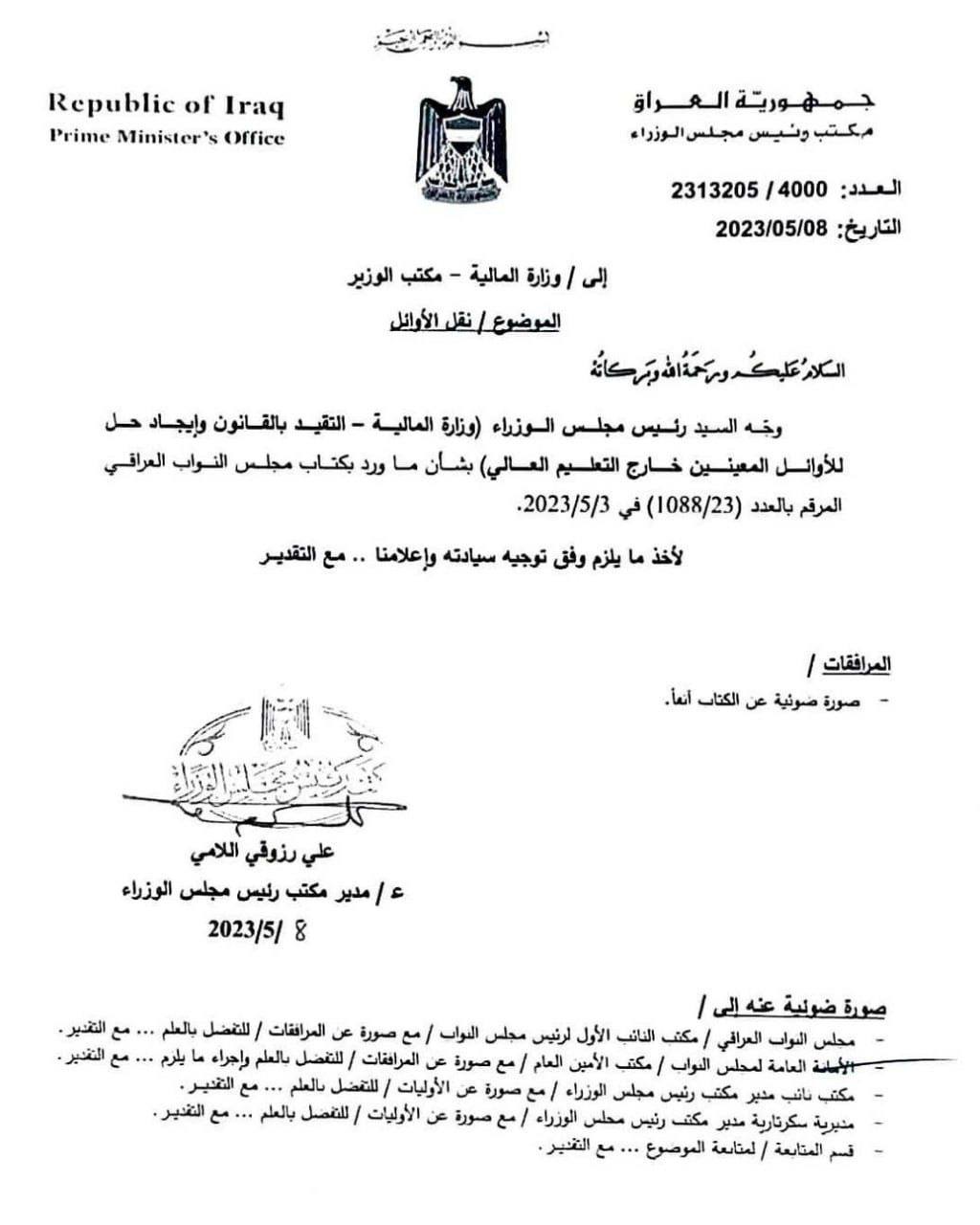 بالوثيقة .... السوداني يوجه وزارة المالية بمعالجة اوضاع الاوائل الذين تم تعيينهم على ملاك بقية الوزارات