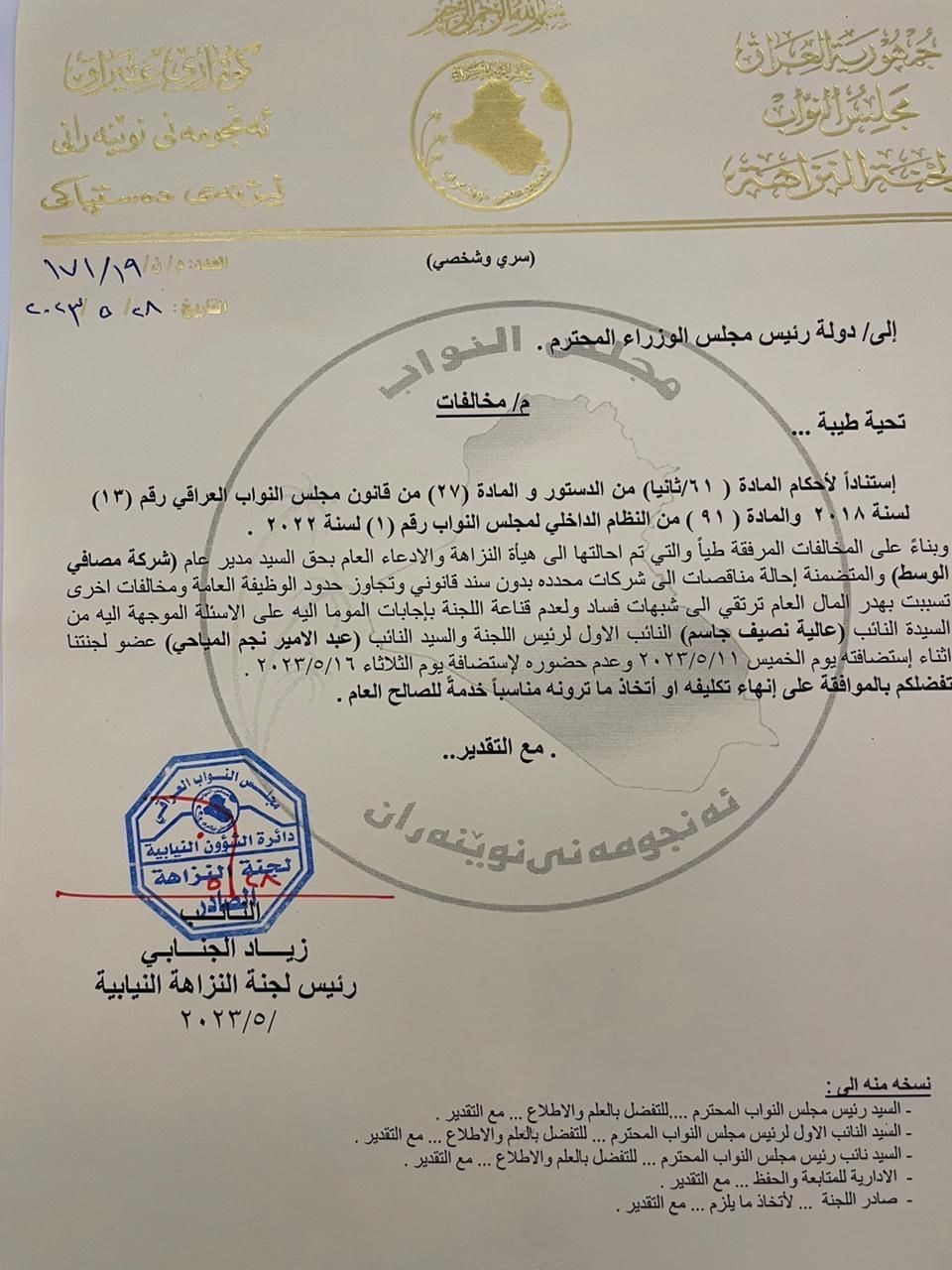 النزاهة النيابية تعلن عدم قناعتها باجوبة مدير عام شركة مصافي الوسط