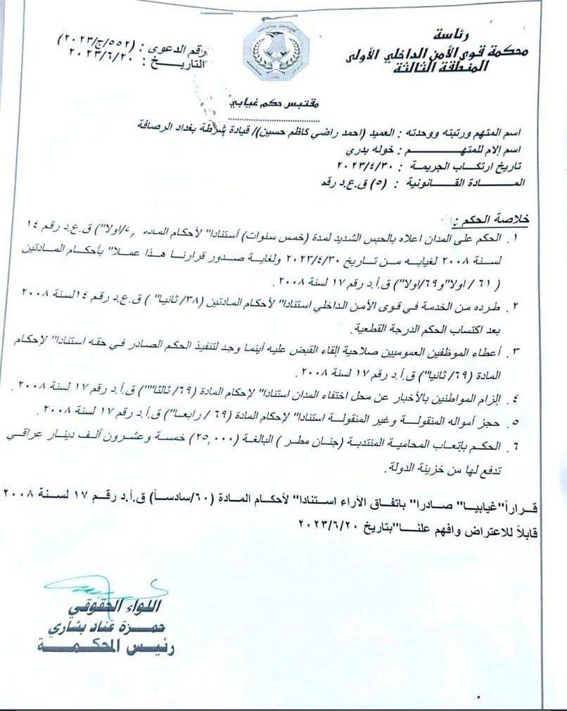 بالوثيقة ::: الحكم على مدير مكتب ابو رغيف العميد الهارب احمد راضي بالسجن لمدة خمس سنوات وطرده من الخدمة