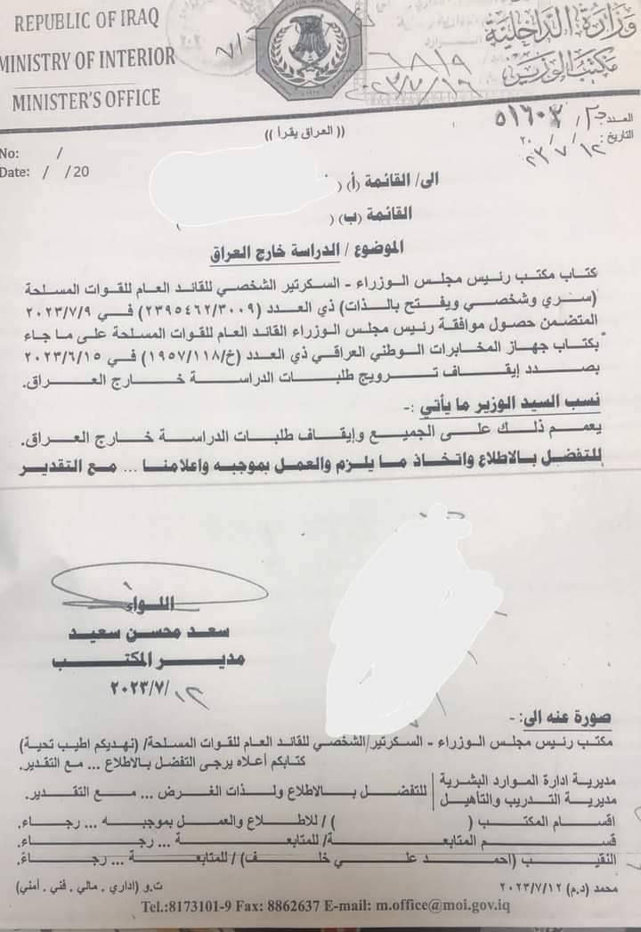 بالوثيقة وزارة الداخلية توجه بايقاف ترويج طلبات الدراسة خارج العراق لجميع الضباط والموظفين والمنتسبين
