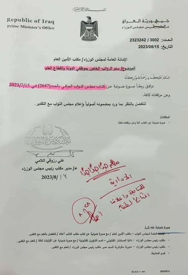 وجه مكتب رئيس مجلس الوزراء الامانة العامة لمجلس الوزراء بأعلام مجلس النواب بخصوص توصيات سلم الرواتب الخاص بموظفي الدولة