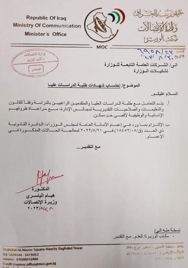 وجهت وزيرة الاتصالات الدكتورة هيام الياسري، باحتساب شهادات طلبة الدراسات العليا اصوليا، مشددة على مراعاة ظروفهم الانسانية والوظيفية.