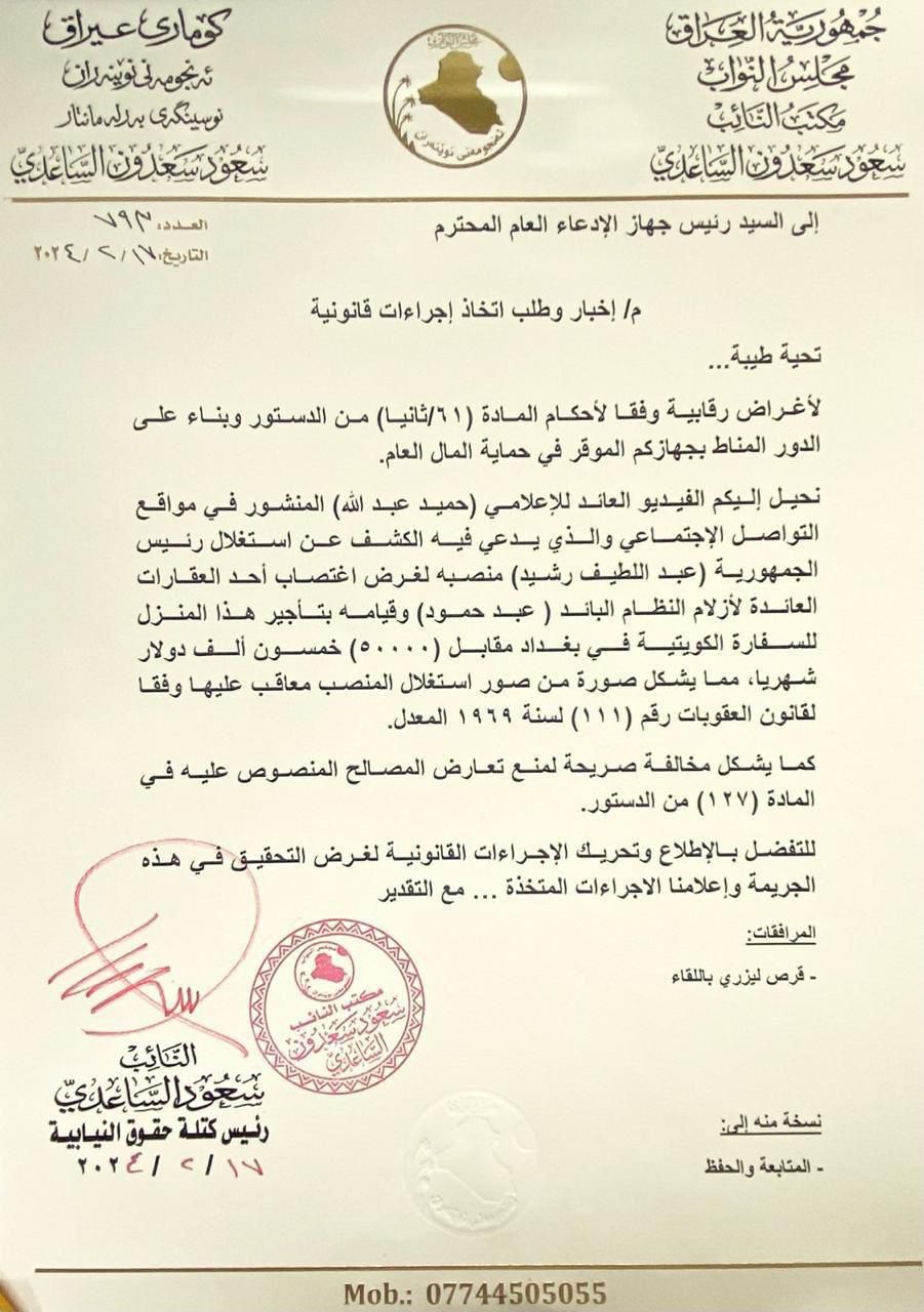 وجه النائب سعود الساعدي اصابع الاتهام إلى رئيس الجمهورية باستغلال منصبه واستئجار احدى عقارات الدولة إلى السفارة الكويتية مقابل 50 ألف دولار شهريا