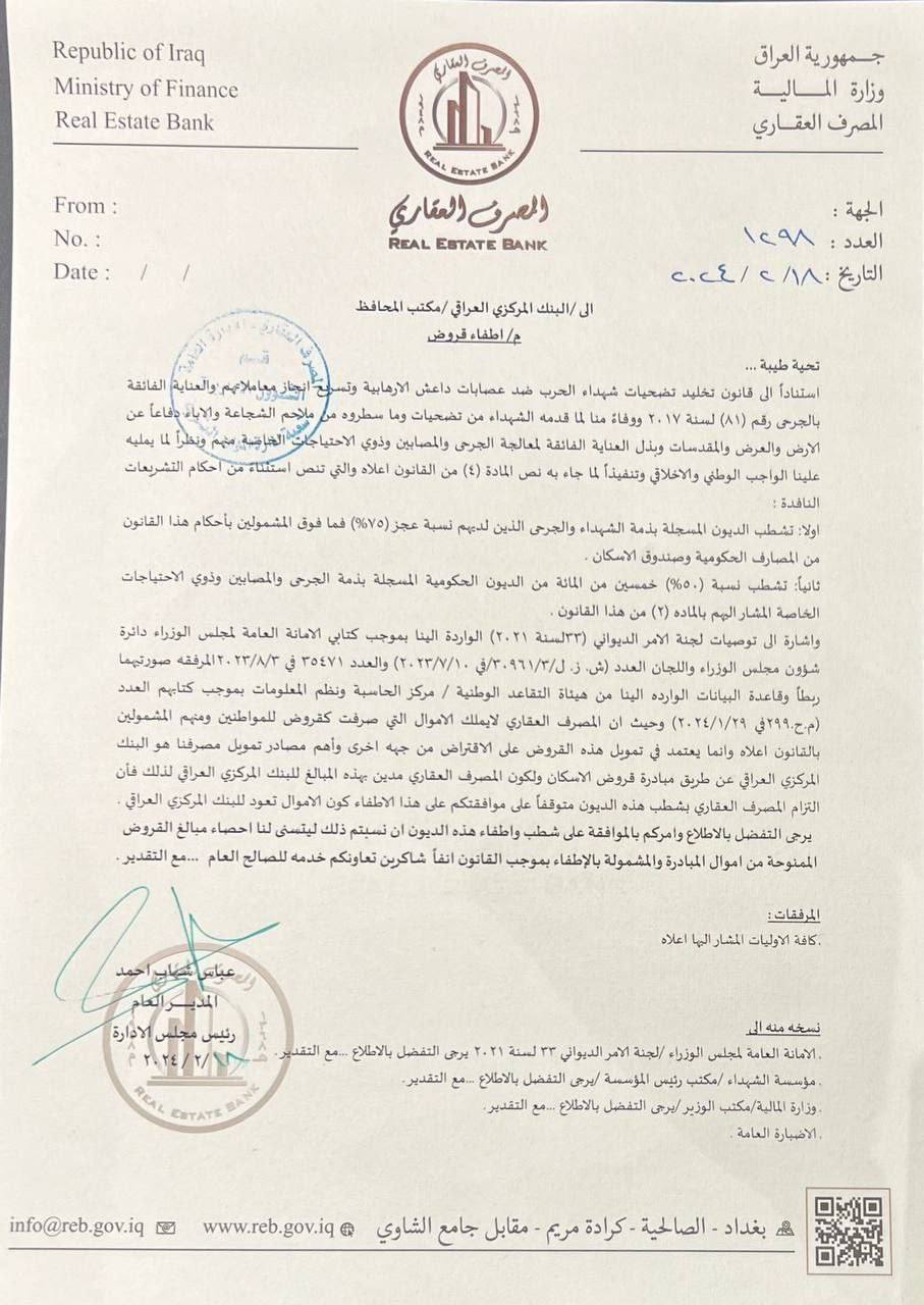 المصرف العقاري يخاطب البنك المركزي لإطفاء القروض للمشمولين بقانون مؤسسة الشهداء
