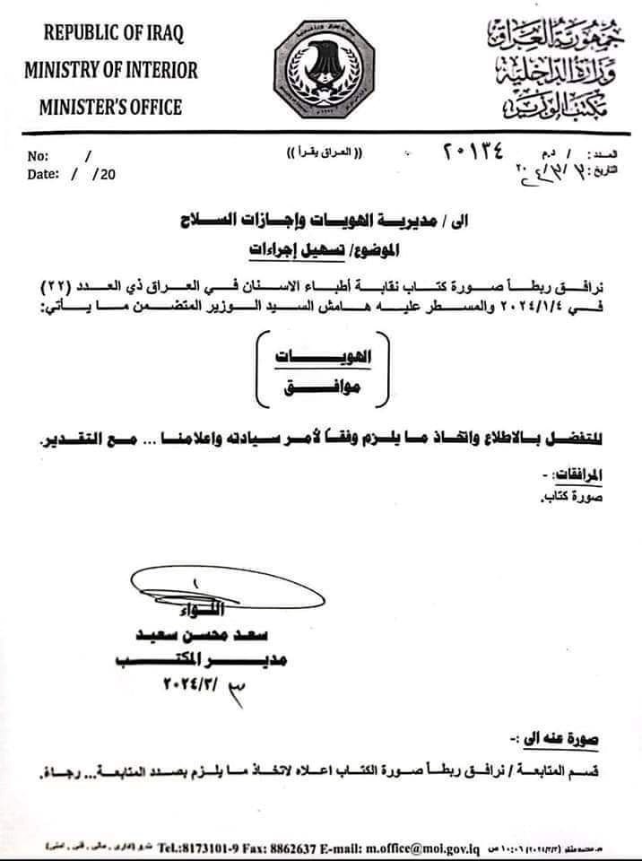 بالوثيقة .. الداخلية توافق على تسهيل اجراءات منح الصيادلة رخصة حمل السلاح