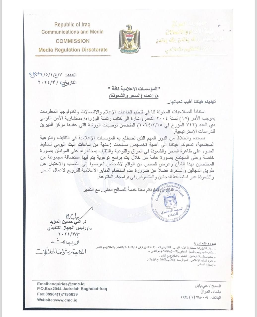اصدرت هيئة الاعلام والاتصالات اعماماً الى المؤسسات الإعلامية كافة بشأن التصدي لظاهرة "السحر والشعوذة"