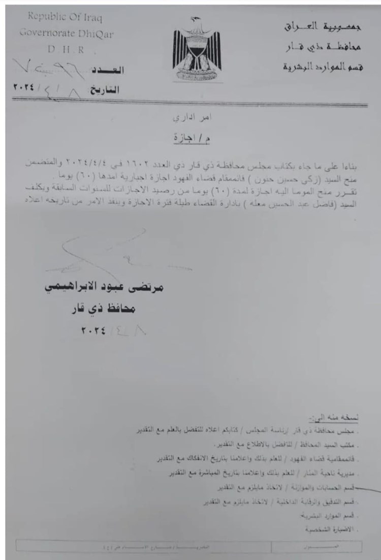 بالوثيقة .. محافظ ذي قار يمنح قائممقام الفهود إجازة إجبارية ويكلف بديلاً عنه