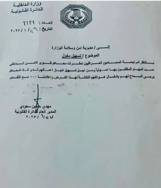 بالوثيقة ... وزارة الداخلية توجه بتسهيل اعمال المحامين داخل مقرات الوزارة