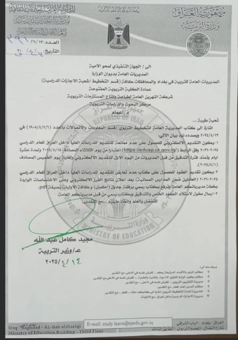بالوثيقة.. التربية تفتح باب الحصول على عدم الممانعة لإكمال الدراسات العليا داخل العراق