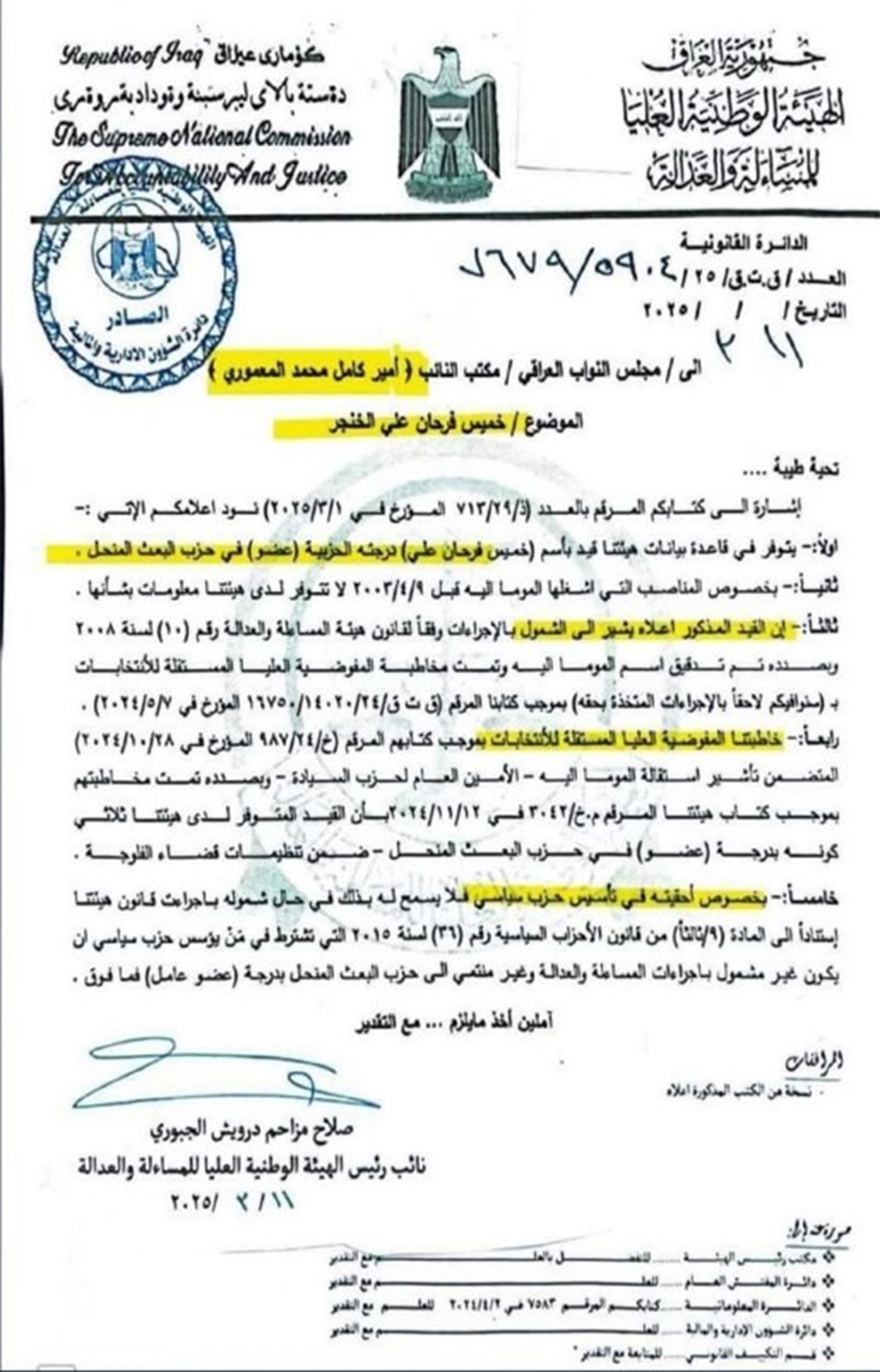 المسائلة والعدالة: لا يحق لخميس الخنجر تأسيس او قيادة أي حزب ولا الترشيح لاي إنتخابات