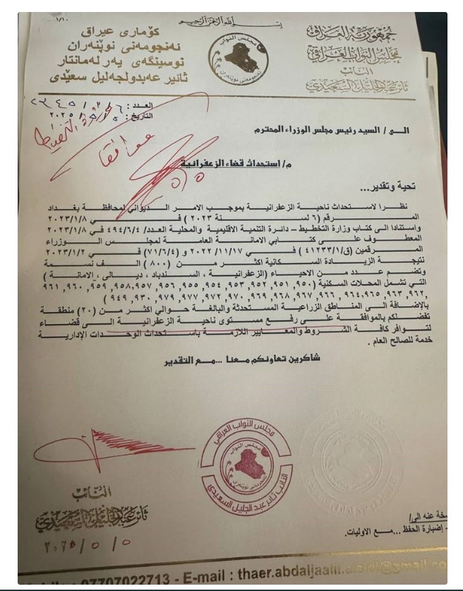 بالوثيقة.. السوداني يوافق على مقترح نيابي لتحويل ناحية الزعفرانية إلى قضاء