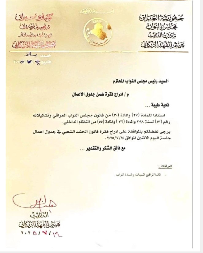 بالوثيقة.. طلب نيابي لإدراج قانون الحشد الشعبي في جلسة اليوم