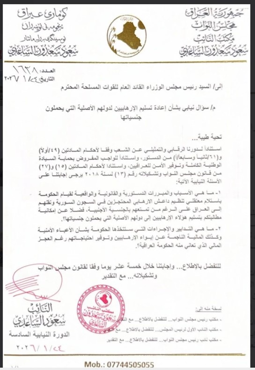 بالوثيقة.. رئيس كتلة حقوق سعود الساعدي يطالب بتسليم الإرهابيين الأجانب من السجون السورية الى دولهم الأصلية بدلاً من العراق