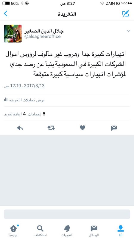 هل دق ناقوس الخطر في السعودية منذرا ببداية النهاية لها ؟؟ سؤال تمت الاجابة عليه من قبل الشيخ جلال الدين الصغير في تغريدة في حسابه على توتير حيث قال انهيارات كبيرة جدا وهروب غير مألوف لرؤوس الاموال السعودية ينبأ عن رصد جدي لمؤشرات انهيار ات سياسية كبيرة متوقعة