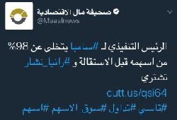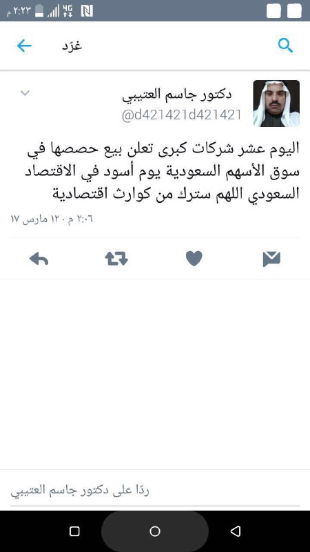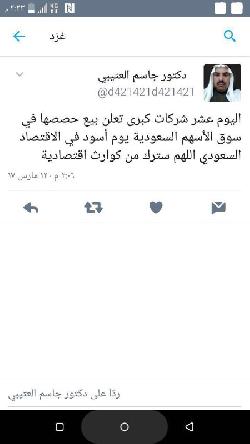 ومصداقا لكلام سماحة الشيخ جلال الدين الصغير جاءت تغريدة الدكتور جاسم العتيبي الذي قال ( اليوم عشر شركات كبرى تعلن بيع حصصها في سوق الاسهم السعودية واصفا الامر بانه يوم اسود في الاقتصاد السعودي اللهم سترك من كوارث اقصادية )