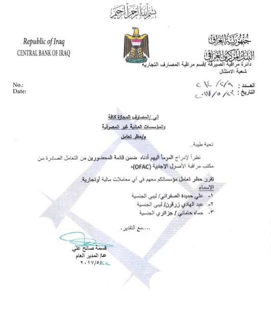 واضاف البنك ان "الاشخاص قد تم ادراجهم ضمن قائمة المحضورين من التعامل الصادرة من مكتب مراقبة الاصول الاجنبية(ofac).